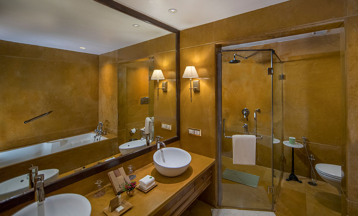 Perched on the top floor, the Penthouse at Suryagarh is a 4,201 sq. ft. retreat that feels more like a private home than a suite. With three bedrooms, cosy living spaces, and a terrace overlooking the desert, it’s designed for quiet luxury. Hand-carved details, soft linens, and shifting natural light create an atmosphere of calm — perfect for mornings with chai or stargazing nights. Ideal for families or those seeking space and serenity.